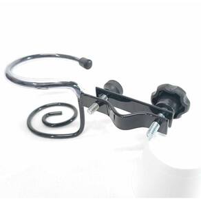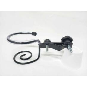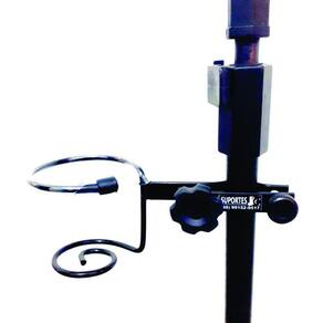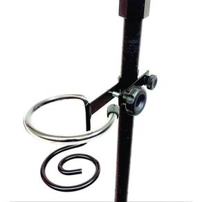 Suporte Simples de líquidos fabricado em metal de grande resistência, pintura epóxi e aro superior ajustável para qualquer tipo de copo ou garrafinhas de água, compacto medindo apenas 26x9x7cm e pesando 220g na cor preto brilho, compacto e fácil de montar em pedestais de microfone padrão. Você que toca em barzinhos, é palestrante ou atua em qualquer atividade que necessite de pedestal e microfone, esse suporte será um ótimo aliado pois vai facilitar muito.