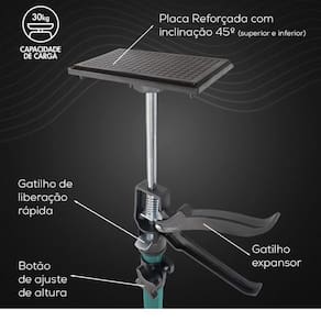 Altura regulável de 500 mm a 1.150 mm (50 a 115 cm), com bases superior e inferior ajustáveis entre 45° e 90°, garantindo total versatilidade para diferentes ambientes e alturas de instalação.
