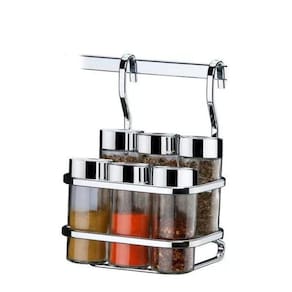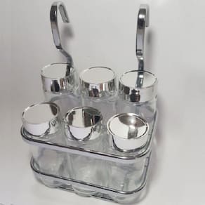 Suporte para temperos que vai deixar sua cozinha linda e Prática. Este suporte tem dois níveis para melhor visualização dos vidros de porta temperos, que são 6, fabricados em vidro, com tampa de fechamento em plástico pintado de cromado. Vai liberar espaço na bancada, facilitar sua vida e deixar tudo sempre lindo e à mão. Essa linha vem com uma proposta de fixar barras nas pares da cozinha e pendurar os suportes e organizadores, para ter mais praticidade e organização. Coordene este suporte com outros acessórios e tamanhos de barra para uma cozinha organizada e com muito espaço. Contém 1 suporte para encaixe em barra de cozinha. As barras e demais itens são ilustrativos e devem ser adquiridos separadamente. Especificações Material: Aço Cromado Material Potes: Vidro Transparente Material Tampas: Plástico ABS Cromado Vidro com capacidade para até 60ml Suporte que pode ser colocado em uma barra Medidas (CxLxA): 14 x 15 x 20 cm Tecnologia Rust Free Consiste em uma camada extra de protetivo especial aplicado sobre as peças cromadas, resultando em uma resistência muito maior contra ferrugem. Informações Adicionais Valor referente a 06 potes de vidro 90 ml, 06 tampas e 01 suporte em aço cromado Não acompanha barra Conteúdo na embalagem 06 potes de vidro 90 ml, 06 tampas e 01 suporte em aço cromado