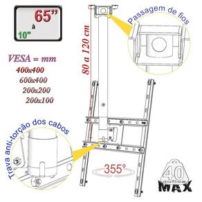 Suporte teto tv 10 a 65 vesa 600x400 braços 120 cm giro 359 preto
