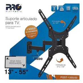 Suporte Tri Articulado Tv De 13-55 Proeletronic Pqst-1355/02 Suporte Tri Articulado Tv De 13-55 Proeletronic Pqst-1355/02 Leve, compacto e super resistente, o suporte PQST-1355/02 possui 4 níveis de movimento, proporcionando várias combinações diferentes para o melhor posicionamento de sua TV. Já vem montado, facilitando ainda mais a instalação. Acompanha passa-cabo, para um excelente acabamento.