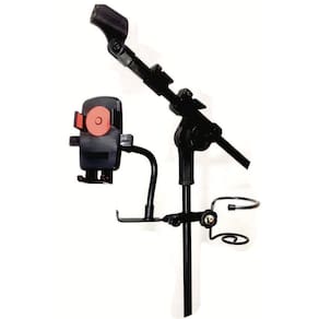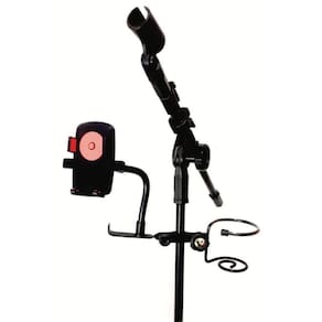 Suporte triplo de celular, copo e pandeiro, todo fabricado em metal de alta resistência, pintura epóxi e de simples instalação desenvolvido por JC suportes para ser acoplado em pedestais de microfone padrão, compacto medindo somente 29x10x10 cm e pesando 312g na cor preto fosco, sendo transportado facilmente, contém um recipiente para colocar seu copo, garrafinha de água, taça de bebidas etc.