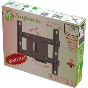 - Suporte Inclinável Multiforma, com 2 movimentos, modelo MF3021, para todos os tipos de telas - Já vem montado - Nosso multi-sistema de montagens dos extensores possibilitam o ajuste perfeito à furação VESA do gabinete da sua TV - O sistema Modula-Fácil é inovador e facilita a montagem mesmo para uma só pessoa, além de reduzir o número de ferramentas necessárias. - Compatibilidade: TV's LED, LCD, Plasma, 3D e Smart TV de 10" até 56" - Furação VESA=mm : 400 x 400, VESA 210, 200x200, 100x100 ou 75x75 - Fixação da TV: 04 pontos, acompanham parafusos M4, M6 e M8 - Inclinação: Frontal de 0º ou 15º - Material : Aço carbono, com fosfatização e pintura eletrostática. - Cor: Preto - Carga Máxima: 30 K - Dimensões do produto montado: 41 x 41 cm - Distância da Parede Max/Min : 6 cm - Garantia : 5 anos, conforme normas do fabricante - Observações: Verifique se a superfície de instalação apresenta resistência suficiente para uma instalação segura, Fique atento a carga máxima indicada para o suporte, Aconselhamos que a instalação seja realizada por um da área, Verifique se a furação de sua TV é compatível com o suporte - Itens inclusos: 01 Suporte montado - 04 Braços extensores - Conjunto de parafusos - Manual com instruções de montagem e garantia impressos na embalagem Marca: Não Informado