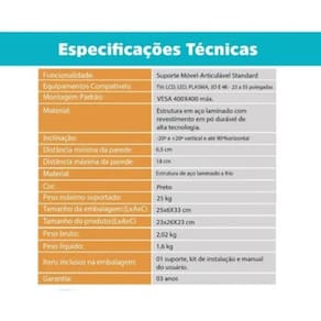 Suporte com haste Dupla reforçada que suporta até 25 Kg. Compatível com TVs planas, ou curvadas de 17 a 55 polegadas.