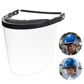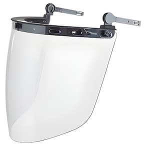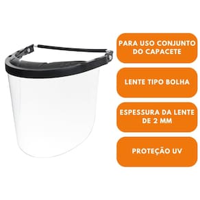 O Suporte para montar o protetor facial no capacete de segurança é fabricado em ABS, é fixado ao capacete por meio de uma mola. A lente tipo bolha é fixada no suporte universal através de pinos plásticos.