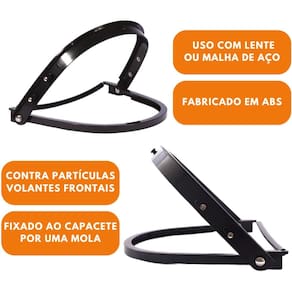 O Suporte para montar o protetor facial no capacete de segurança é fabricado em ABS, é fixado ao capacete por meio de uma mola. A proteção facial é fixada no suporte universal através de pinos plásticos.