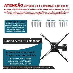 Suporte articulado brasforma para tvs lcd, led, plasma, 3d e smart tv de 10 até 56 polegadas com vesa máximo de 400x400mm . Permite inclinação, articulação e rotação 3 movimentos . Permite ajustar a tv para assistir de vários ângulos. Ideal para salas, escritórios, quartos, hospitais, restaurantes, entre outros locais. Diferenciais 5 anos de Fácil instalação Conteúdo da embalagem 1 suporte para tv Hastes extensoras para vesa 400x400mm Kit de parafusos 1 manual de instruções 4 parafusos m4 x 25mm 4 parafusos m6 x 20mm 4 parafusos m8 x 25mm 3 parafusos com buchas para fixação na parede Kit completo de instalação Observações Verifique se a superfície de instalação apresenta resistência suficiente para uma instalação segura. Fique atento a carga máxima indicada para o suporte. Aconselhamos que a instalação seja realizada por um da área. Verifique se a furação de sua tv é compatível com o suporte.