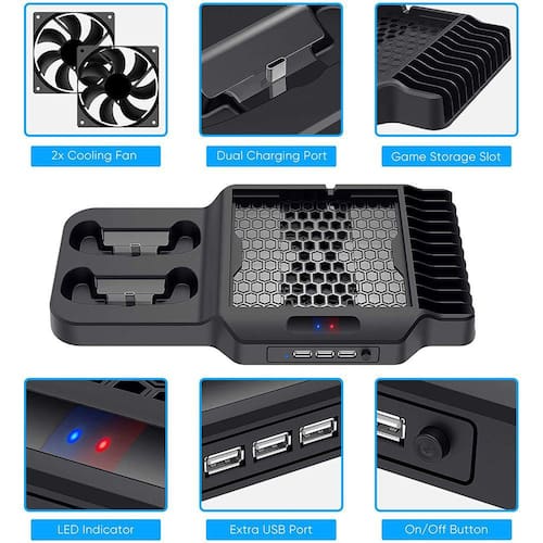 Suporte vertical com ventoinha de arrefecimento compatível com a estação de carregamento Xbox Series XS YUANHOT com portas de carregador de comando duplo Sistema de armazenamento e arrefecimento de jogos Design tudo-em-um: Mantenha a consola, os comandos sem fios e os jogos organizados; Além disso, ele carrega os controles e dissipa o calor para a compatibilidade do console: o suporte vertical é compatível com o console Xbox Series X/S. Um presente ideal para os entusiastas de jogos (Nota: console, controladores e jogos não estão incluídos) Sistema de Resfriamento: Built-in 2 ventiladores de resfriamento de alta velocidade, alta eficiência e design de baixo ruído. Não há necessidade de se preocupar com o superaquecimento do console. Mantém a funcionalidade funcional e melhora a vida operacional Carregador de Controlador Duplo com Indicadores LED - Carregue até 2 controladores simultaneamente ou simplesmente armazene quando não estiver em uso. Com o indicador LED, saiba o estado de carregamento de relance. Facilita o carregamento dos seus comandos, poupando tempo e mantendo-os arrumados Design de poupança de espaço: o suporte minimiza o espaço ocupado pelos acessórios, mantendo-os numa posição vertical e mantém a sua área de jogo arrumada Suporte vertical com ventoinha de arrefecimento compatível com Xbox Series X/S, YUANHOT Charging Station com portas de carregador de comando duplo, Sistema de Armazenamento e Resfriamento de Jogos Carregue até 2 controladores simultaneamente ou simplesmente armazene-os quando não estiverem em uso. Com o indicador LED, saiba o estado de carregamento de relance. Facilite o carregamento dos controles Mantenha seu console Xbox Series X/S, controles sem fio e jogos organizados, economizando tempo e mantendo-os arrumados Equo com 3 portas USB estendidas, oferecendo mais opções