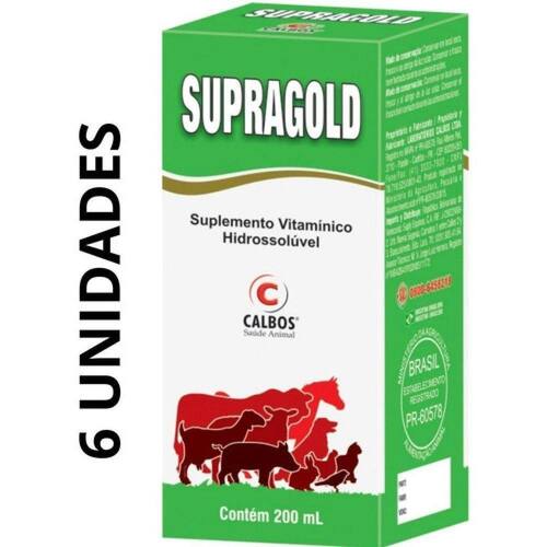 SUPRAGOLD é uma associação de Vitaminas Hidrossolúveis. Alta concentração de Vitaminas E, suplemento vitamínico líquido, que auxilia o animal a alcançar taxas de metabolismo e crescimento ideais, melhora os índices reprodutivos, aumenta o apetite, atua como anti-stress e é adjuvante em processos infecciosos, aumentando as defesas orgânicas do animal.