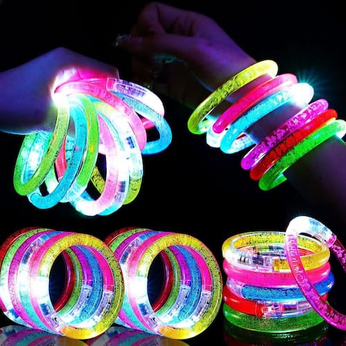-?24 peças de suprimentos para festas a granel?A pulseira Light up vem em 36 unidades de bastões luminosos a granel. Os suprimentos de festa que brilham no escuro têm 2,56” de diâmetro e 3,35” de diâmetro externo, e o conector é removível e pode ser em pulsos grandes. Por causa do material plástico, as pulseiras de LED não quebram facilmente. Embaladas individualmente, oferecem uma melhor experiência de abertura. As lembrancinhas iluminadas são adequadas para todos e estão disponíveis em 6 4 cores, 4 de cada cor podem atender às suas necessidades diárias de uso e substituição em festas.