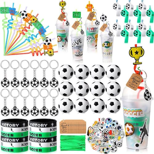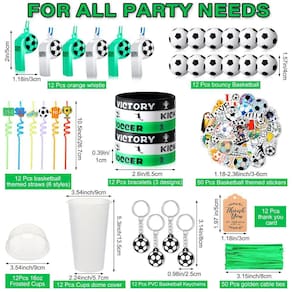 - Suprimentos suficientes para festas de futebol: você receberá 12 copos com tampa de cúpula, 12 peças de canudos de futebol, 12 peças de apitos de futebol, 12 peças de chaveiros de futebol, 12 peças de minisfutebol, 12 peças de pulseira de silicone com tema de futebol, 12 peças de etiquetas de agradecimento, 50 peças de adesivos com tema de futebol, 50 peças de gravatas giratórias, quantidade suficiente para atender às suas necessidades diárias ou de festa