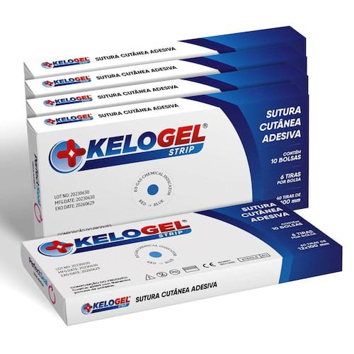Sutura cutânea ponto falso kelogel strip 12mmx100mm 300un Tamanho: 12mmx100mm Kelogel strip - sutura cutanêa adesiva Composição do produto:Curativo estéril com filamentos poroso de poliésterDescrição de produto:O fechamento de pele com kelogel strip perfectseal é indicado como substituição de outros métodos de fechamento no tratamento de lacerações e incisões cirúrgicas. Também podem ser usados conjuntamente com suturas a linha e grampos, ou após a remoção deles, para maior sustentação.Indicado como substituição de outros métodos de fechamento no tratamento de lacerações cutâneas e incisões cirúrgicas. Também podem ser usados conjuntamente com suturas a linha e grampos, ou após a remoção deles, para maior sustentação.São fabricadas de não tecido poroso, com filamentos para reforço de sua estrutura e com adesivo hipoalergênico.Instruções de uso:1. Limpar e secar a pele.2. Abrir a embalagem e retirar a cartela totalmente.3. Segurar a extremidade da tira e levante-a da cartela.4. Ao usar a tira para suturar a pele, sem pontos ou grampos, juntar as bordas da pele com os dedos ou pinças. Colocar as tiras de um lado ao outro do ferimento, de forma a assegurar uma aplicação sem tensão.5. Em ferimentos maiores, posicionar de forma a distribuir a tensão. Colocar as tiras com aproximadamente 3mm a 5mm de espaço entre elas.6. Podem-se colocar tiras adicionais paralelas a ferida e aproximadamente a 10mm das extremidades das fitas. Isto pode reduzir a força de cisalhamento a que a ferida está submetida.Instruções de uso:Todos os produtos adesivos aplicados sobre a pele, uma pequena porcentagem da população pode apresentar irritação na pele ou injúria durante o uso ou na remoção.Não aplicar as tiras adesivas sob tensão, pele danificada com bolhas e falta de adesão podem ocorrer se for verificado tensão excessiva.O uso com outros produtos adesivos pode causar bolha e injúria na pele.Advertência:Para reduzir o risco de infecção não reutilize as tiras e descarte as tiras não utilizadas. Na ocorrência de alguma reação e/ou alteração na pele, descontinue o uso e observe. Caso persista algum sinal/sintoma, consulte um profissional de saúde. Nos casos em que haja o acompanhamento de um profissional de saúde, siga a orientação previamente fornecidaBolsa:Contém: 5cx 50 bolsas 6 tiras por bolsaTamanho: 12mm x 100mm registro anvisa 81926099008