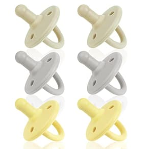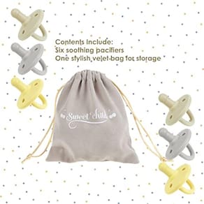 Vendido em Packs of Six! Nossas Sweetie Soothers são vendidas em pacotes de Six em cores coordenadas, e cada conjunto apresenta o mesmo design adorável na alça. Perfeito para coordenar com as roupas do seu bebê! Possui 2 orifícios de ar extra-grandes para maior segurançaCada chupeta é feita de um design de peça única e possui dois orifícios de ar extra-grandes para maior segurança. Cada chupeta é testada de acordo com os padrões de segurança da ASTM, para que você possa se sentir confiante em dá-la ao seu bebê! Cofre para lava-louças! Estas chupetas são seguras para lava-louças apenas no rack superior e também são seguras para esterilizadores a vapor de micro-ondas.