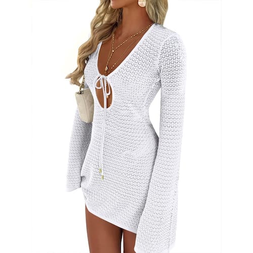 - Características: saída de praia feminina de crochê, mangas compridas, laço frontal, vazado, malha. Este maiô feminino é perfeito para praia, férias, uso diário.