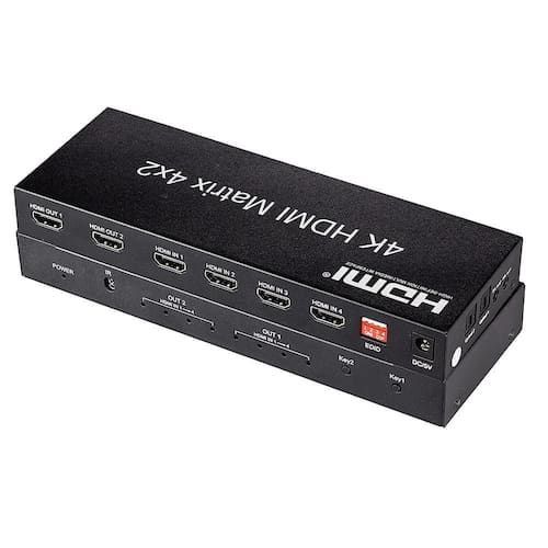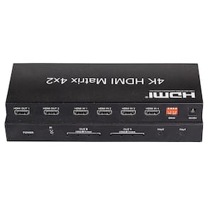 Switch Hdmi 4x2 Com Controle 2k, 4k, 3d E Full Hd O Switch Matrix 4x2 distribui a informação de até quatro dispositivos eletrônicos compatíveis com o protocolo de transmissão HDMI em pelo menos dois terminais de exibição. Aparelho possui saída independente para cabo de fibra ótica e fone de ouvido estéreo. Este Splitter multiplicador de sinal, auxilia em diversas atividades: exibições em eventos corporativos, reuniões empresarias, ambientes escolares, salas de conferências e treinamentos educacionais ou empresariais. Conecte quatro fontes de sinal HDMI Full HD em televisores, projetores ou telas de exibição. Compatível com desktop, laptop, de TV digital, DVD, home theater, blueRay videogame e outros aparelhos. Vem com controle remoto para selecionar os aparelhos com comodidade. Utilize o IR intuitivo para alternar livremente a fonte do sinal. INFORMAÇÕES: Suporta HDMI 1.4b, HDCP 2.2 Suporta formato de vídeo 3D Suporta a mais alta resolução até 3840x2160 / 30Hz Suporta 3,4 Gbps e até 340Mhz Suporta cor profunda 8/10/12 bit Suporta LPCM / Dolboy / DTS 5.1 canais CONTEÚDO: 1x Matrix HDMI 4x2 1x Controle 1x Fonte Bivolt 1 manual ESPECIFICAÇÃO Entrada: 4x HDMI Saída: 2x HDMI Tamanho AxLxP : 20 x 7 x 2,7 cm Resolução Suportada: 3840 x 2160 Distância Máxima cabo entrada : até 10m AWG 26 Distância Máxima cabo saída : até 15m AWG 26 Peso do Produto: 300 gramas Alimentação: DC 5V : 3 meses Homologação Anatel: 060792000160 Marca: Não Informado