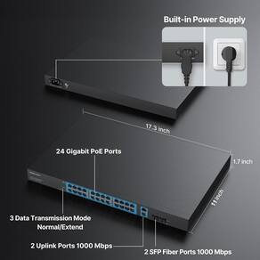 - ?Plug and Play? 24 portas Gigabit PoE e 2 portas RJ45 de 1G + 2 portas SFP de 1 G switch PoE não gerenciado, fácil configuração sem necessidade de instalação ou configuração de software. Não tem endereço IP ou interface web.