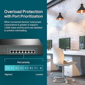 - Configuração PoE flexível de 8 portas Gigabit completo – 8 portas RJ45 PoE+ (802.3at/af) 10/100/1000 Mbps oferecendo até 30 W por porta e orçamento total de energia PoE de 153 W.