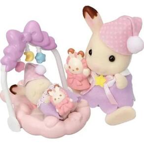 Sylvanian Familes Irmas noite dos sonhos Epoch 5806 A hora de dormir é divertida com este conjunto que inclui a menina Chocolate Rabbit e o bebê embalado com uma academia para bebês e acessórios combinando. A adorável academia para bebês com um móbile embalará o bebê embalado para dormir. A bebê embalado Chocolate Rabbit tem um design especial para dormir com os olhos fechados. A menina e o bebê embalado estão usando pijamas combinando com toucas de dormir. O fantoche pode ser colocado na mão da menina. Idade recomendada: A partir de 3 anos de idade.