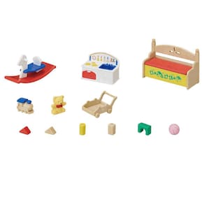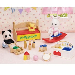 Os bebês Roy Pookie e Sophie Snow são melhores amigos e adoram brincar juntos no berçário. Este conjunto colorido inclui duas figuras, além de uma caixa de brinquedos que abre, cozinha para brincar, cavalo de balanço e uma série de brinquedos extras para brincar também. Inclui bebê coelho branco e bebê panda. Muito para adicionar ao berçário com este lindo conjunto