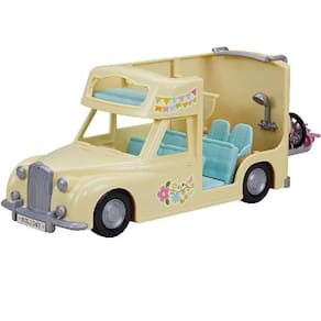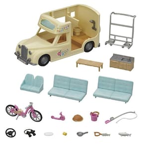 Unidade principal, Direção, Assento / cama x2, Assento para bebê, Kitchenette, Mesa, Frigideira, Sabugo de milho, Peixe grelhado, Prato, Bicicleta de montanha infantil, Bicicleta para bebê, Capacete, Vara de pesca, Balde, Peixe, Binóculos, Carregador traseiro (um total de 19 peças).