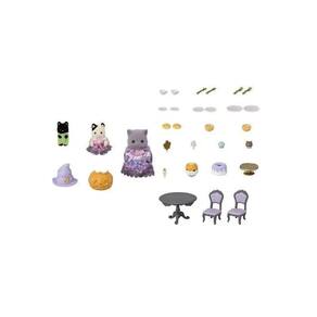 O conjunto inclui acessórios temáticos de Halloween, como doces e guloseimas, além de pequenas abóboras e um balde para as crianças guardarem os doces. Ele é ideal para complementar a coleção Sylvanian Families e criar cenários divertidos de Halloween.