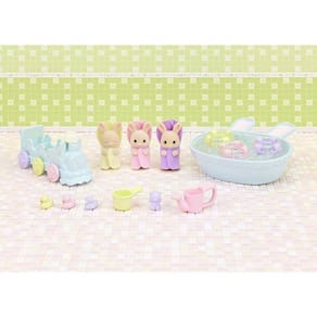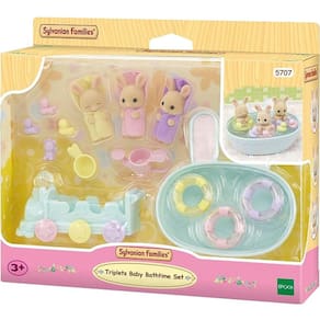 O Conjunto Hora do Banho - Trigêmeos inclui os trigêmeos Coelhos de Leite, juntamente com tudo o que eles precisam para um banho cheio de diversão! Inclui um carrinho para os trigêmeos passearem e muitos brinquedos de banho e acessórios.