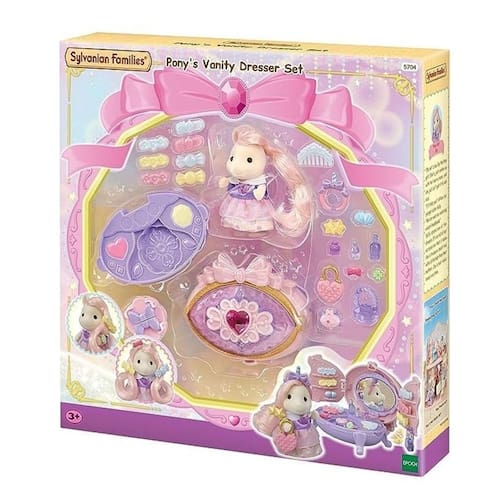 O conjunto penteadeira da pônei é um conjunto de acessórios para cabelo que inclui a menina pônei com um espelho compacto e acessórios para cabelo. O espelho compacto pode ser aberto para se transformar em uma penteadeira com um espelho e prateleiras. Os acessórios incluídos podem ser guardados dentro da penteadeira. O pedaço de fita no meio do espelho compacto pode ser utilizado como um banquinho para a cômoda. A penteadeira também pode ser utilizada para que se exiba acessórios. Apresentando a menina pônei de cabelo rosa, joy. Combine com o salão de beleza elegante - ponei ou com o conjunto cabeleireiro da pônei ambos vendidos separadamente para uma brincadeira ainda mais imaginativa