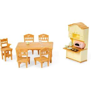 O Conjunto Sala de Jantar Clássica inclui uma mesa de jantar e cadeira de bebê adequada para até 5 personagens e um armário de cozinha adorável para armazenar utensílios de cozinha.