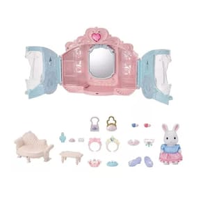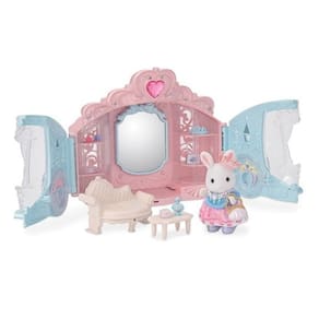 O Vestiário Estiloso e Cintilante vem com uma linda carruagem brilhante, acessórios e a menina Coelho Neve vestida de princesa. As portas duplas da carruagem abrem para se transformar em um quarto estiloso com muitos acessórios lindos e prateleiras para colocá-los. Vem com muitos acessórios para que você possa criar vários looks. O carrinho tem uma alça para que você possa usá-lo como maleta para transportar a boneca e acessórios.