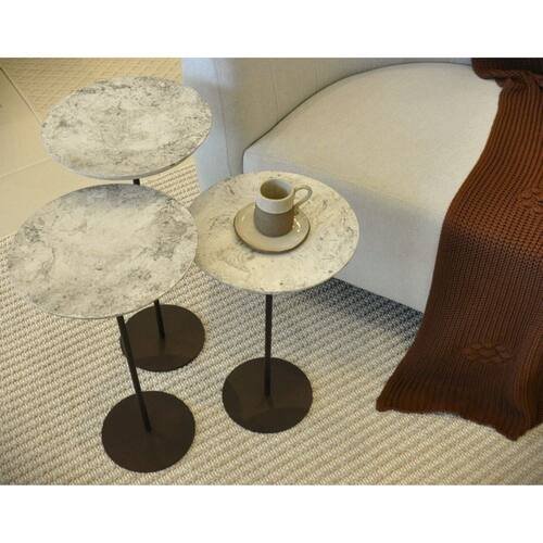 T-3 Mesas Laterais Norina BAIXA/MÉDIA/ALTA, tampos MDF/Marmorizado Imersos e bases Aço Corten. Acabamento da Base: Pintura Acabamento do Tampo: Pintura Ambiente Principal: Sala de Estar Complexidade da Montagem: Baixa: pode ser montado por uma pessoa sozinha Cor: Marmorizado Cor do Produto: Marmorizado Dobrável: Não Escala de Brilho: Semi-Brilho Espessura do Tampo: 18 mm Extensível: Não Informações Complementares: Atributos e Benefícios: Montagem e ou desmontagem extremamente fácil e rapidíssima; em torno de 60 segundos, observando sempre os três passos conforme ilustrados no nosso Manual Prático de Montagem que acompanha nossas Criações. Caso necessite levar nossa Itens Inclusos: 1 (uma) mesa desmontada, com suas devidas proteções e manual prático de montagem. Linha ou Coleção: Coleção Manual de Especificação Técnica: https://product-hub-prd.madeiramadeira.com.br/904383/documents/465f9098-8eeb-4ef0-8ce8-901efa6dfc23453textoparamadeiramadeira.pdf Manual de Montagem e Instalação: https://product-hub-prd.madeiramadeira.com.br/904383/documents/82ec1856-fc66-459e-be37-830d4a20a81fticodemontagemkarlaenorina.pdf Material da Base: Aço Material do Tampo: MDF Material Principal: MDF Medida do Tampo (L x C x E): Diâmetro de 0,30 cm x 18 mm Necessita Montagem: Sim Origem do Produto: Nacional Peso: 3,1 kg Possui Base: Sim Possui Espelho: Não Possui Possui Gavetas: Não Possui Portas: Não Possui Prateleiras: Não Possui Rodízio: Não Possui Suporte Giratório: Não Recomendações de Uso, Manutenção e Limpeza: Mesa lateral, mesa de apoio, mesa de cabeceira ou, em ambientes em que possa ser útil e funcional. Evitar exposição externa ao sol e chuva. Para limpeza orientasse utilizar uma flanela levemente umedecida em 50 % de água morna e 50 % de alcool 70%. Após, passar uma flanela seca. Sistema de Montagem: Emborcar o tampo sem a retirada da proteção de borda, em seguida rosquear levemente a haste a flange do tampo e posteriormente rosquear o disco da base na parte superior da haste e aplicando um leve aperto ao final do movimento. Após, retirar a proteção e Suporta Até (kg): 20 kg Marca: Ava Mobiliário