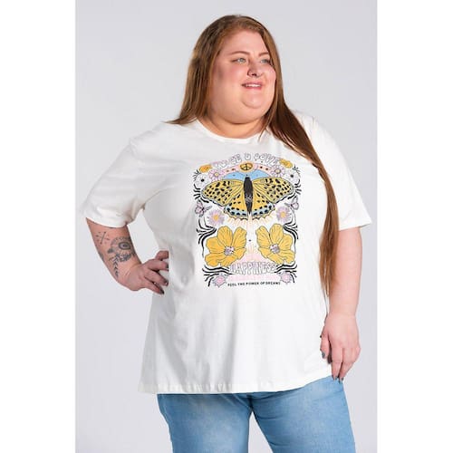 T-shirt feminina plus size elaborada em malha algodão. Possui Estampa na frente "PEACE & LOVE HAPPINES IS ALWAYS MY MOOD”, leve, macia e com inúmeras possibilidades de uso. Monte looks desde casuais aos chiques, com aquele nozinho na frente, uma bermuda jeans e seu tênis favorito por exemplo e arrase! Para ficar em casa bem confortável, curtir um passeio ou trabalhar você terá a peça ideal.