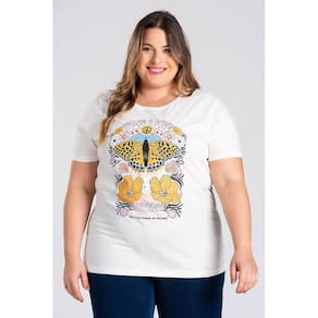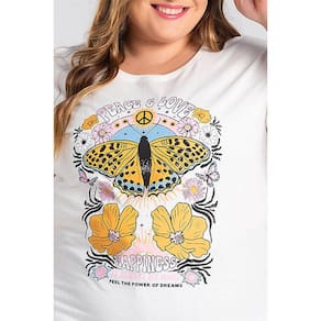 T-shirt feminina plus size elaborada em malha algodão. Possui Estampa na frente "PEACE & LOVE HAPPINES IS ALWAYS MY MOOD”, leve, macia e com inúmeras possibilidades de uso. Monte looks desde casuais aos chiques, com aquele nozinho na frente, uma bermuda jeans e seu tênis favorito por exemplo e arrase! Para ficar em casa bem confortável, curtir um passeio ou trabalhar você terá a peça ideal.