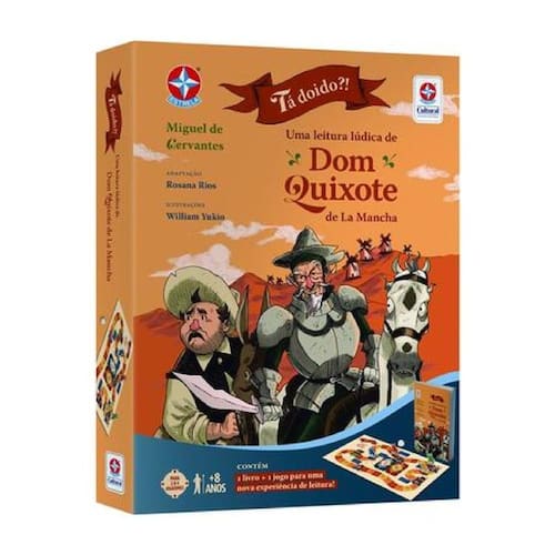 Ta Doido! Uma Leitura Ludica de Dom Quixote de La Mancha - - Estrela Imagine um homem que, de tanto ler, fica louco e sai por aí em busca de aventuras, desejando enfrentar magos, monstros e até dragões. A experiência de leitura do clássico Dom Quixote de La Mancha, do espanhol Miguel de Cervantes, é enriquecida com o jogo de tabuleiro e cartas “Tá doido?!”, no qual os participantes precisam ler a história para um melhor desempenho, respondendo a perguntas sobre a aventura de Dom Quixote e “pagando micos” ao ter de imitar muitas das loucuras do cavaleiro da triste figura! 1 LIVRO DE 96 PÁGINAS 64 CARTAS DESAFIOS 64 CARTAS PERGUNTAS 1 DADO 4 PEÕES (FIGURAS DE CAVALEIROS) 4 BASES PARA PEÕES 1 TABULEIRO