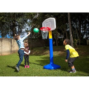 O esporte se aprende desde criança. Este brinquedo tem 3 regulagens de altura que permitem que desde o priminho pequeno até o tio grandão possam se divertir com ele. Quando as bolas passam a ser arremessadas com mais força, é só encher a base da tabela com água ou areia para dar maior estabilidade e pronto. Totalmente desmontável, é fácil levá-la para a quadra do prédio, a varanda do sítio ou a quadra da escola. Na piscina, pode ser colocada na beirada ou dentro dela para um delicioso basquete aquático. Já vem acompanhada de uma bola. Basta montar e sonhar com o surgimento de um poderoso "Dream Team" !