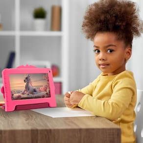 Design pensado para o uso infantil Acompanhado de uma case emborrachada e resistente com alca o tablet e protegido contra quedas e oferece mais conforto e seguranca durante o uso Ideal para maos pequenas e para a rotina agitada das criancas