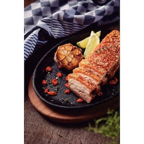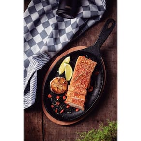 Design e praticidade. Ideal para preparar e servir alimentos. Chapa fabricada em ferro fundido, altamente resistente, podendo ser utilizada diretamente sobre o fogão, 380x182x36mm. Tábua em Madeira Teca FSC.