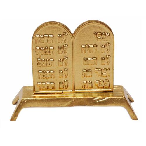01 tabuas da lei grande de mesa em metal dourada com escritas em hebraico, os dez mandamentos