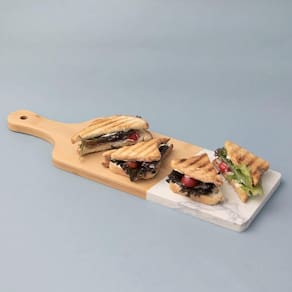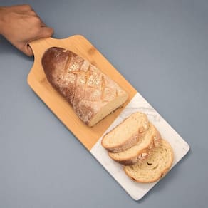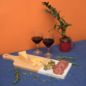 A Tábua de Bambu e Mármore da OIKOS serve para servir e cortar frios, sanduíches, entradinhas e mais!