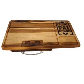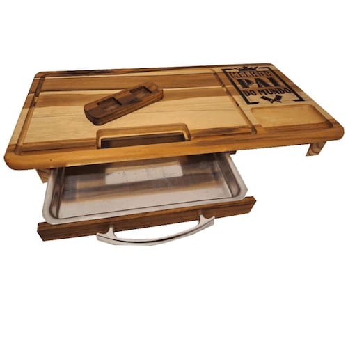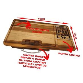 Tabua de churrasco com gaveta melhor pai do mundo presente Tábua de carne com gaveta feita em madeira naval teca Otima resistencia Desenhos em alto relevo usinados e pintados Acabamento em óleo vegetal Lixada Tábua acompanha uma assadeira número 1 baixa em alumínio e uma tampa para o recipiente de carne, também um recorte para encaixar a latinha de cerveja da sua marca preferida. : Ótimo presente para quem adora um churrasco. As cores podem sofrer variações em relação a foto por conta da madeira. Medidas: 60x30x7cm Marca: Não Informado Ean: 7898181013840