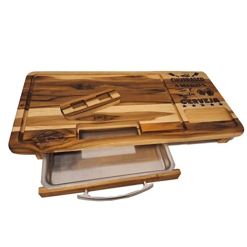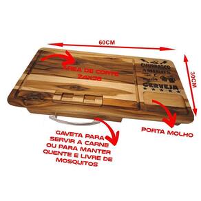 Tabua de churrasco com gaveta churrasco amigos e muita cerveja Tábua de carne com gaveta feita em madeira naval teca Otima resistencia Desenhos em alto relevo usinados e pintados Acabamento em óleo vegetal Lixada Tábua acompanha uma assadeira número 1 baixa em alumínio e uma tampa para o recipiente de carne, também um recorte para encaixar a latinha de cerveja da sua marca preferida. : Ótimo presente para quem adora um churrasco. As cores podem sofrer variações em relação a foto por conta da madeira. Medidas: 60x30x7cm Marca: Não Informado Ean: 7898181013833