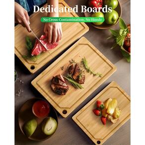3. Feita com bambu 100% natural, a tábua de corte Kitsure é uma excelente opção para a preparação de alimentos. Não inferior à tábua de cortar açougueiro, a tábua de cortar carne Kitsure é adequada para picar e cortar pesados. Sua superfície lisa e pré-lubrificada é excepcionalmente suave para facas, ajudando a manter suas lâminas afiadas por mais tempo.