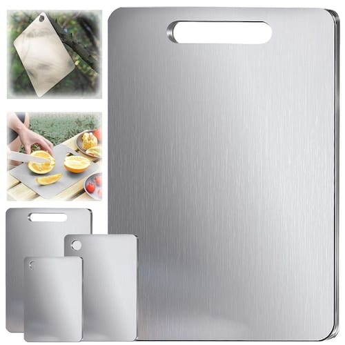 Tábua de corte de acampamento de titânio 100% puro — Tábua de cortar lavável na máquina de lavar louça Tamanho: ?M?: 10,6 * 6,6 polegadas ?L?: 12,6 x 8,6 polegadas ?GL?: 14 * 10 polegadas -?A escolha mais segura e saudável?Nossa tábua de cortar carne de titânio feita de titânio 100% puro - não contém cortes, ranhuras ou perfurações causadas por facas. A tábua de corte de metal para carne garante um ambiente de cozinha mais seguro e saudável -?Descongelamento rápido e fácil?Chega de esperar! Nossa tábua de cortar cozinha pode ser lavada na máquina de lavar louça possui uma função de descongelamento rápido. A tábua de corte puro para cozinha permite que você desfrute de ingredientes totalmente descongelados em pouco tempo -?Superfície fácil de usar facas?Proteja suas facas com nossas tábuas de cortar para cozinha! Sua dureza ideal garante cortes suaves enquanto mantém suas lâminas afiadas e intactas -?Durável e resistente a rachaduras?Diga adeus às rachaduras e fendas! Projetadas para uso pesado, as tábuas de corte que podem ser lavadas na máquina de lavar louça evitam que alimentos e líquidos grudem. Basta enxaguar com água e o metal puro da tábua de corte de titânio seca instantaneamente -?Design estável e versátil?Desfrute de uma experiência de corte estável com nossa tábua de corte de dupla face. Seu design de dupla face ajuda a separar os ingredientes, e a alça prática torna a tábua de cortar fina fácil de mover, armazenar e pendurar, mantendo sua cozinha arrumada