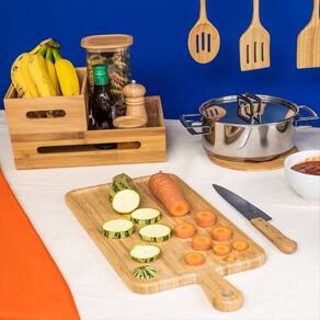 Essa é a tábua de corte de bambu 49,4cm da OIKOS. Versátil bacana para cortar carnes, legumes, pães e muito mais! Design Decorativo ela também ajuda a compor a decoração da mesa e da casa. o tom natural do bambu deixa os ambientes mais rústicos e charmosos. Fácil de guardar possui um furo próprio para pendurar a tábua na churrasqueira ou na parede da cozinha – além de ser Prática, fica linda ;) com pega bacana para facilitar no manuseio e transporte! feita de bambu Material leve e ecologicamente correto. Durável e higiênica o bambu é resistente e tem propriedades que evitam a proliferação de bactérias, só precisa lavar e secar de acordo com as recomendações, combinado?