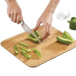 Tábua de corte dobrável de cozinha em bambu e silicone 32cm A tábua conta com uma inovadora dobradiça de silicone, que permite que você simplesmente dobre as laterais da tábua para formar uma rampa, através da qual alimentos picados podem ser guiados de forma ordenada para a panela. Facilite suas tarefas na cozinha com a tábua para corte de bambu com silicone dobrável da lyor, uma peça versátil e inovadora que traz funcionalidade e praticidade para o seu espaço culinário. Fabricada em bambu, uma matéria-prima sustentável, a tábua oferece resistência e durabilidade para o seu uso diário, sendo também uma escolha consciente para o meio ambiente. A tábua conta com uma superfície de silicone que proporciona aderência e evita que os alimentos escorreguem durante o corte, garantindo segurança e precisão. Com a capacidade de dobrar-se, a tábua se torna fácil de armazenar em espaços reduzidos, otimizando sua cozinha e proporcionando praticidade. Nossa tábua possui um tamanho versátil, adequado para cortar e picar uma variedade de alimentos. Perfeita para preparar refeições deliciosas em sua cozinha e também, facilitando na hora de guardar, pois ela dobra e pode ser colocada na gaveta.