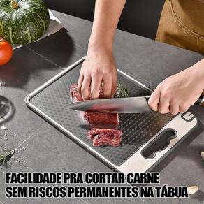 Funções e Benefícios: Dupla Face: lado em aço para cortes pesados e descongelamento rápido lado em plástico com moedor de alho embutido e bandeja coletora de líquidos Afiador Integrado: Mantenha suas facas sempre afiadas com praticidade e segurança Mais Higiene: Evita contaminação cruzada entre alimentos crus e cozidos Alta Durabilidade: Não retém odores, não mancha e é resistente a riscos profundos