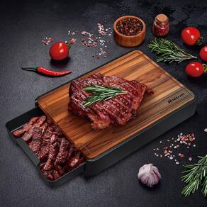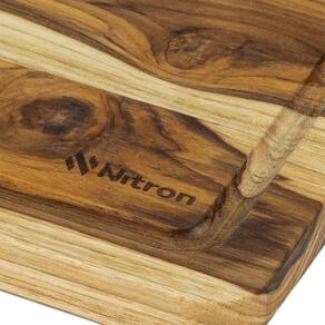 Especificações: Madeira nobre de origem legal; Alta resistência a água; Alta durabilidade; Resistente a micro-organismos; Resistente ao empenamento; Fácil higienização; Não agride o fio das facas; Pés antiderrapantes; Canaleta para reter líquidos; Com suporte para a tábua; Com gaveta removível;