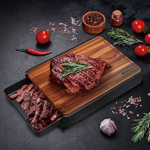 Especificações: Madeira nobre de origem legal; Alta resistência a água; Alta durabilidade; Resistente a micro-organismos; Resistente ao empenamento; Fácil higienização; Não agride o fio das facas; Pés antiderrapantes; Canaleta para reter líquidos; Com suporte para a tábua; Com gaveta removível;