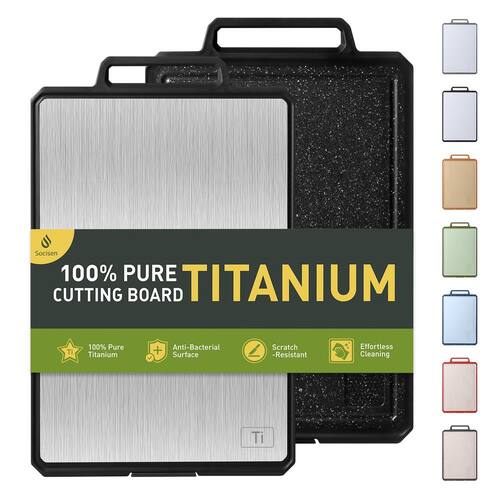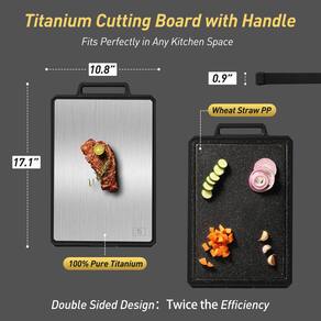 - Tábua de corte de titânio puro para uso versátil: as tábuas de corte de titânio Socisen para cozinha apresentam um lado de titânio 100% puro de grau alimentício para fatiar carnes e um lado PP para frutas e legumes. Este design de dupla face garante segurança alimentar e versatilidade, permitindo que você manuseie diferentes ingredientes de forma eficiente. Perfeita para cozinhar todos os dias, esta tábua de corte oferece uma solução de corte durável e prática para suas necessidades de cozinha.
