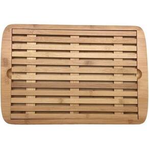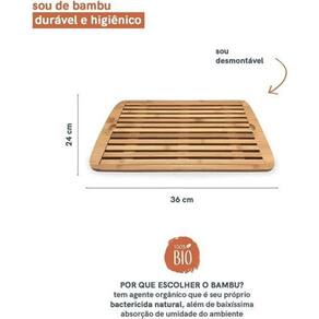 Características da Tábua de Pão de Bambu Migalheira Oikos A tábua de pão tem 2 cm de altura, 24 cm de largura e 36 cm de comprimento. Por ser feita de madeira do tipo bambu, ela tem a durabilidade e resistência do material, podendo suportar quedas e impactos comuns no dia a dia. A superfície conta com uma grade de madeira que pode ser retirada para que ocorra a limpeza das migalhas de pão de maneira eficiente. Além disso, sua tonalidade bege natural combina com diversas decorações e dá um ar rústico e elegante à cozinha.