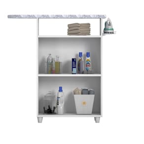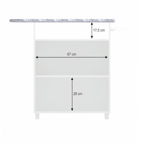 Altura: 86cm Comprimento: 118 cm Profundidade: 36 cm MDP 15mm Suporte para ferro elétrico 04 pés fixos de plástico na cor branca Puxador PVC cromado Dobradiça Metal Curva Tampo como acabamento em espuma e tecido poliéster. Pintura UV Brilho Não possui cabideiro Suporte de peso 13kg Garantia de 03 meses